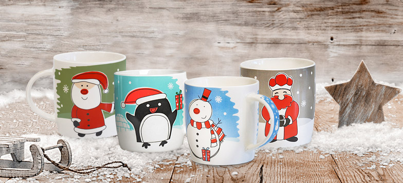 4 Tazas/Mugs de porcelana con motivos navideños naif