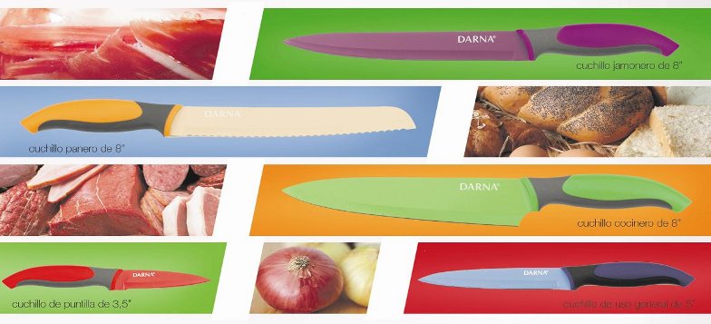 JUEGO DE 5 CUCHILLOS DE COLOR CON ESMALTE ANTIADHERENTE + TACOMA DE METACRILATO