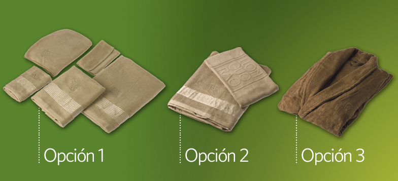 OPCION 1: Toalla cabeza 25x65 cm., toalla lavabo 90x50 cm., toalla tocador 30x50 cm., toalla desmaquilladora 27x17 cm. y toalla ducha 70x130 cm. PRECIO: 29,95 €
