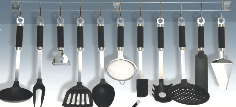 ACABADOS EN NYLON Y ACERO INOXIDABLE. CON RECUBRIMIENTO ANTIADHERENTE QUE NO RAYA LAS SUPERFICIES Y RESISTENTES HASTA LOS 210º.