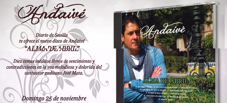 ANDAIVÉ ES EL NOMBRE ARTÍSTICO DEL CANTANTE Y AUTOR ANDALUZ NACIDO EN CÁDIZ, JOSÉ MATA. EL CD CONTIENE 10 TEMAS INÉDITOS PROPIOS DEL CANTAUTOR GADITANO, ENMARCADOS EN UN ESTILO MÁS CERCANO AL POP QUE AL FLAMENCO, AUNQUE SIN ABANDONAR SUS RAÍCES NETAMENTE ANDALUZAS. TEMAS LLENOS DE SENTIMIENTO Y CONTRADICCIONES EN LA VOZ MELODIOSA Y DOLORIDA DE ESTE CANTAUTOR GADITANO.