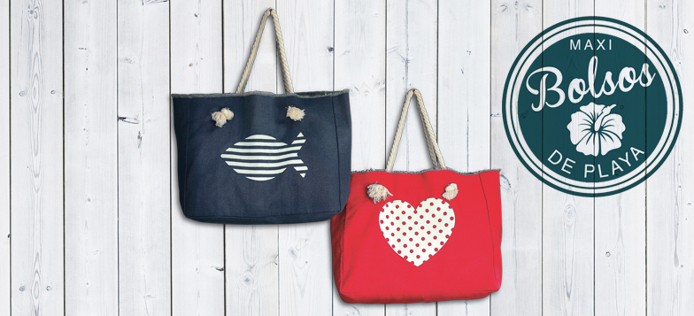 Dos grandes bolsos de playa de tamaño familiar (50x40x14 cms.) y fabricados en algodón 100%, con diseños y colores distintos para que elijas cómo ir a la playa.